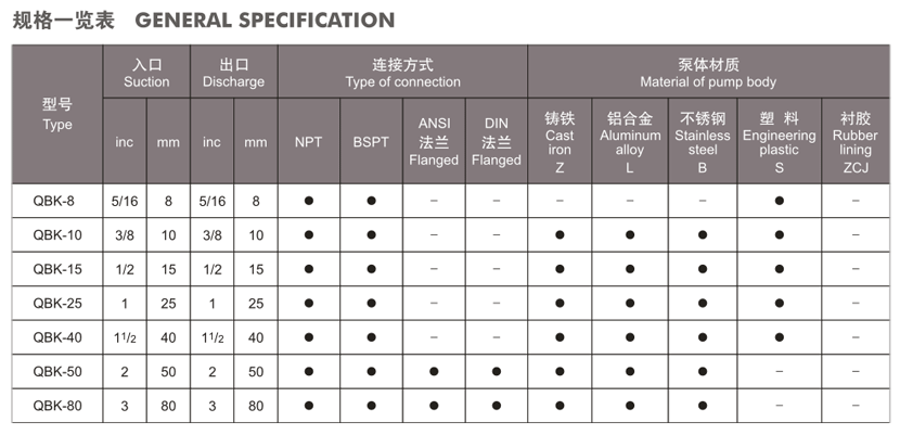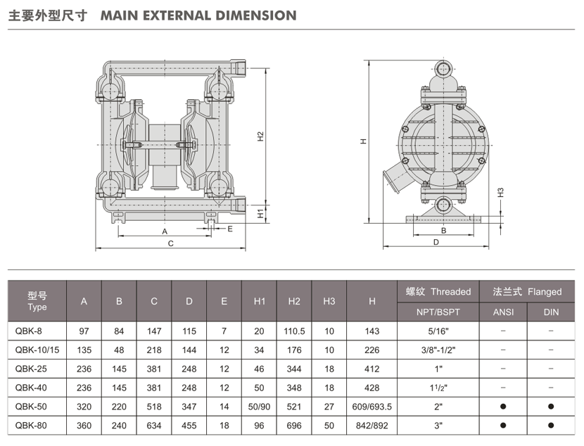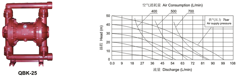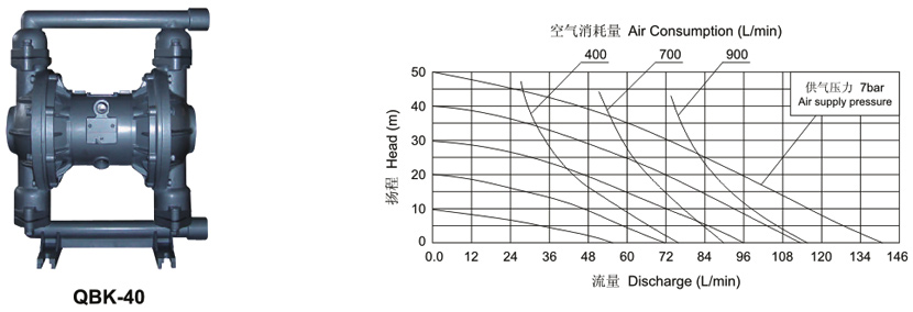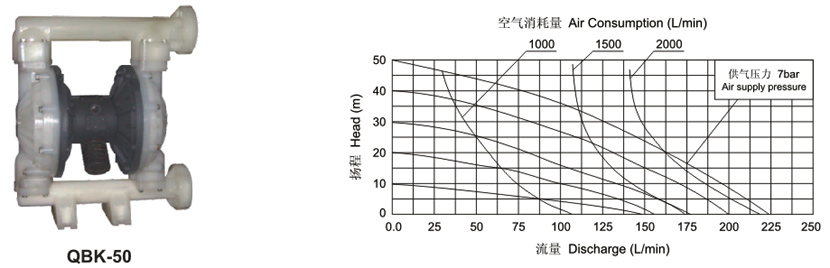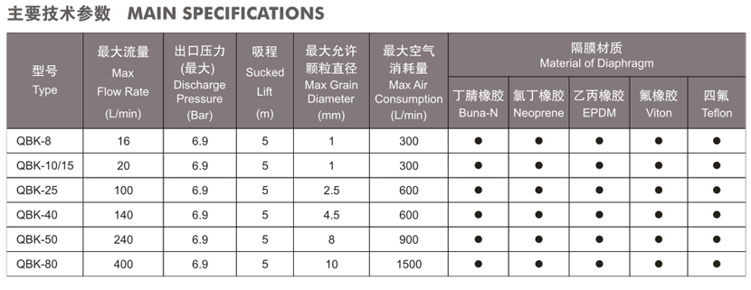 第三代氣動隔膜泵是我公司開發(fā)的第三代氣動隔膜泵,具有使用壽命長,不會停頓等優(yōu)點,它既能抽送流動的液體,又能輸送一些不易流動的介質(zhì),具有自吸泵、潛水泵、屏蔽泵、泥漿泵和雜質(zhì)泵等輸送機械的許多優(yōu)點。 1、不需灌引水.吸程高達5m.揚程達70m.出口壓力≥6bar。 2、流動寬敞,通過性能好.允許通過大顆粒直徑達10mm。抽送泥漿、雜質(zhì)時,對泵磨損甚微; 3、揚程、流量可通過氣閥開度實現(xiàn)無級調(diào)節(jié)(氣壓調(diào)節(jié)在1~7bar之間): 4、該泵無旋轉(zhuǎn)部件,沒有軸封,隔膜把抽送的介質(zhì)與泵的運動部件、工件介質(zhì)完全隔開,所輸送的介質(zhì)不會向外泄漏。所以抽送有毒、易揮發(fā)或腐蝕性介質(zhì)時,不會造成環(huán)境污染和危害人身安全; 5、不必用電.在易燃、易爆場所使用安全可靠; 6、可以浸沒在介質(zhì)中工作; 7、使用方便、工作可靠、開停只需簡單地打開和關(guān)閉氣體閥門.即使由于意外情況而長時間無介質(zhì)運行或突然停機泵也不會因此而損壞.一旦超負荷,泵會自動停機,具有自我保護性能,當負荷恢復正常后,又能自動啟動運行; 8、結(jié)構(gòu)簡單、易損件少,該泵結(jié)構(gòu)簡單,安裝、維修方便,泵輸送的介質(zhì)不會接觸到配氣閥,聯(lián)桿等運動部件,不象其他類型的泵因轉(zhuǎn)子、活塞、齒輪、葉片等部件的磨損而使性能逐步下降; 9、可輸送較粘的液體(粘度在1萬厘泊以下); 10、本泵無須用油潤滑,即使空轉(zhuǎn).對泵也無任何影響,這是該泵大特點。 參數(shù)規(guī)格表