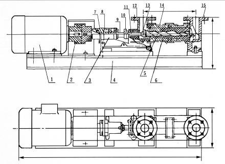 I-1B系列單螺桿濃漿泵由電動(dòng)機(jī)、聯(lián)軸器、泵和底座四個(gè)部分組成(見附圖)。 配用的動(dòng)力采用Y系列三相異步電動(dòng)機(jī)(六極)。聯(lián)軸器采用水泵用爪型彈性聯(lián)軸器。泵由泵殼、空心軸、萬向鉸接頭、繞軸、螺桿、襯套、軸封裝置和出料口等組成,螺桿的斷 面為圓形、襯套斷面為橢圓形,其內(nèi)表面為雙螺旋面。